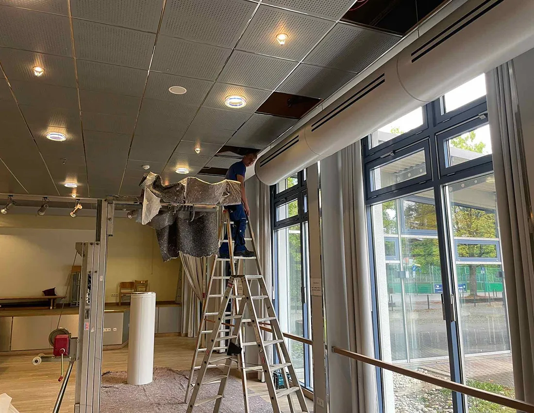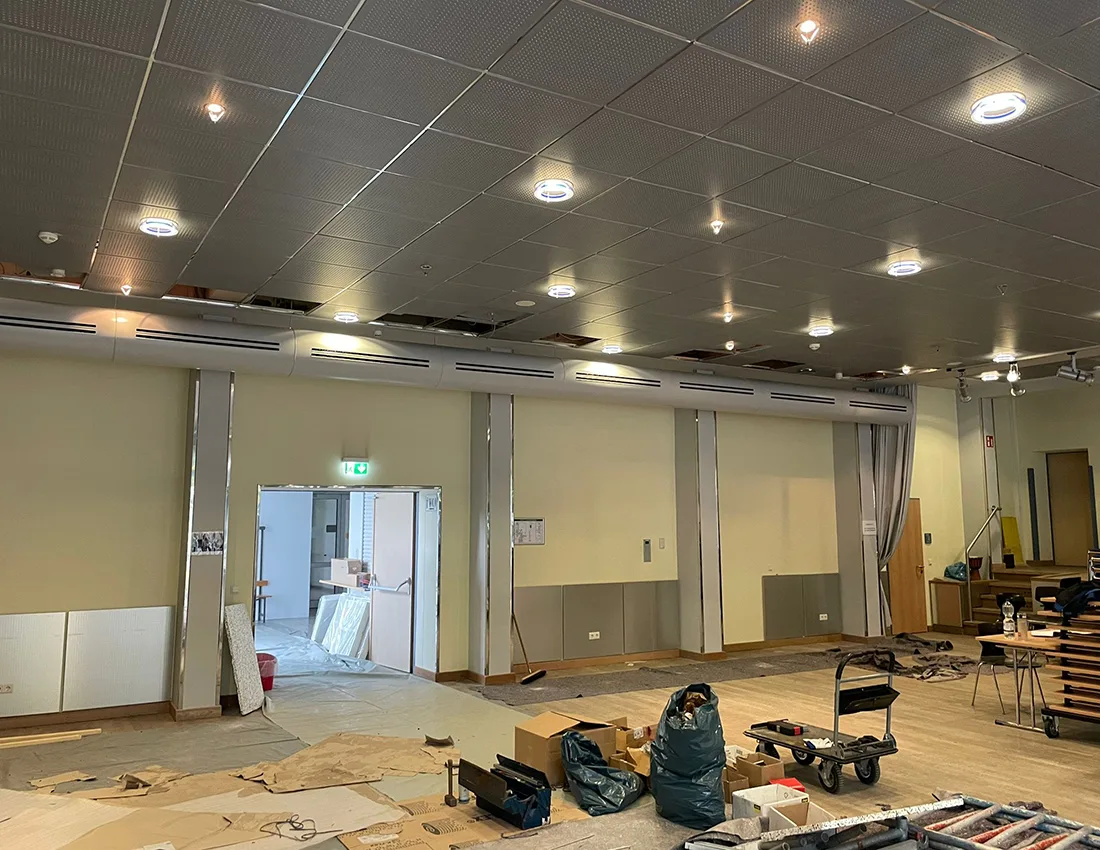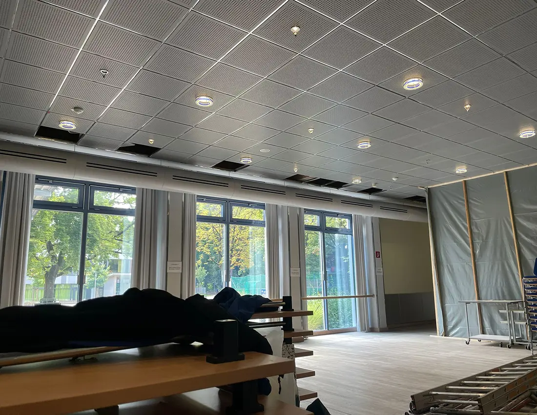 In der Aula der Mittelschule Dieselstraße – die zugleich als Mensa für rund 300 Schüler genutzt wird – wurde eine moderne Be- und Entlüftungsanlage neu installiert. Die Anlage ist mit einer Wärmerückgewinnung sowie einer Wärmepumpe zur Nachheizung und Kühlung ausgestattet. Damit wird eine energieeffiziente und ganzjährig angenehme Raumluftqualität gewährleistet. Für die Luftverteilung kommt das Zuluftsystem der Firma SLT zum Einsatz. Das Rohrsystem wurde farblich auf die Einrichtung abgestimmt und fügt sich harmonisch in das architektonische Gesamtbild der Aula ein. Fortsetzung folgt …