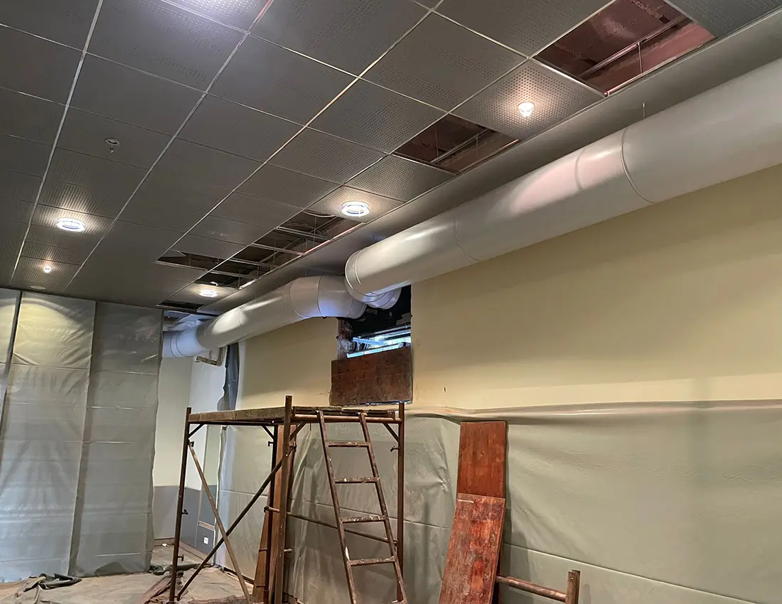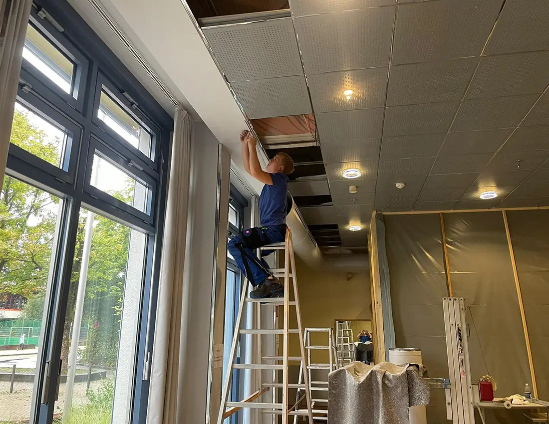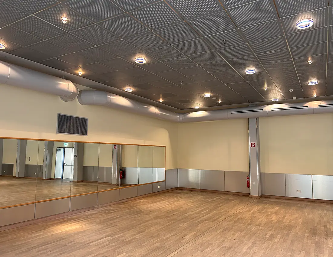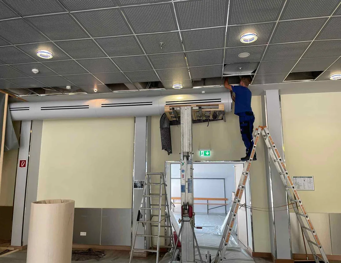 In der Aula der Mittelschule Dieselstraße – die zugleich als Mensa für rund 300 Schüler genutzt wird – wurde eine moderne Be- und Entlüftungsanlage neu installiert. Die Anlage ist mit einer Wärmerückgewinnung sowie einer Wärmepumpe zur Nachheizung und Kühlung ausgestattet. Damit wird eine energieeffiziente und ganzjährig angenehme Raumluftqualität gewährleistet. Für die Luftverteilung kommt das Zuluftsystem der Firma SLT zum Einsatz. Das Rohrsystem wurde farblich auf die Einrichtung abgestimmt und fügt sich harmonisch in das architektonische Gesamtbild der Aula ein. Fortsetzung folgt …