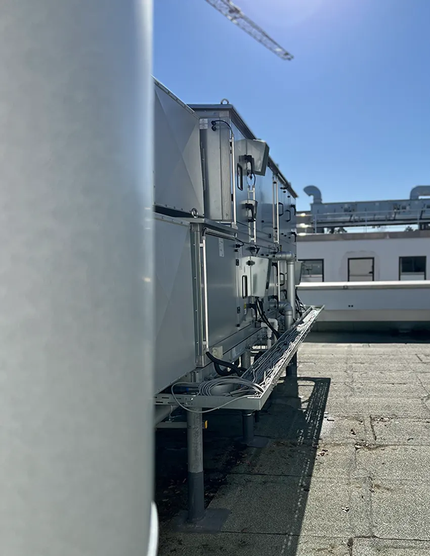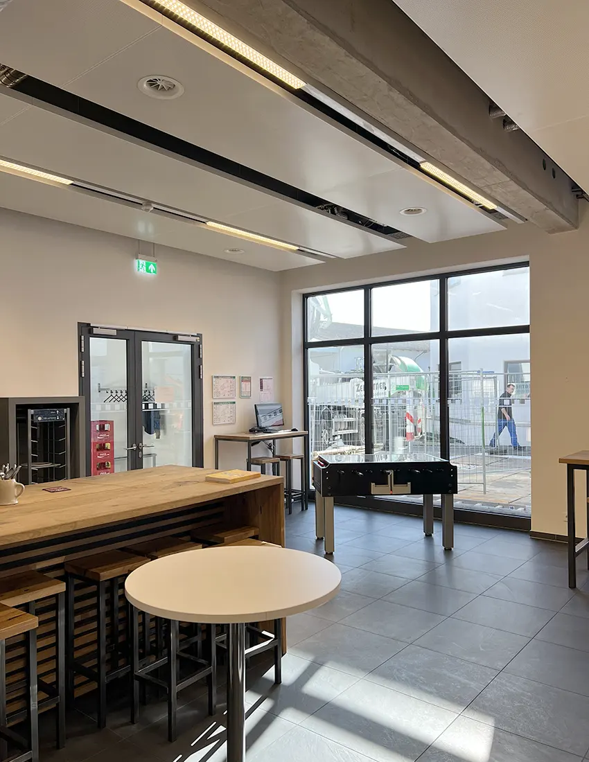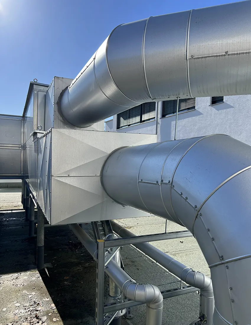 Für die Dickow Pumpen GmbH & Co. KG, Spezialist für hochwertige Kreiselpumpen für Industrieanwendungen, wurde im Jahr 2024 ein neuer Gebäudeteil vollständig errichtet. Entstanden ist eine moderne Kaltküche mit vorgelagerter Essensausgabe sowie einem einladenden Ess- und Aufenthaltsbereich. Die komplette Lüftungstechnik – für Küche und Essbereich – wurde von uns, Köhler HLS, geplant und umgesetzt. Das dafür installierte Lüftungsgerät befindet sich auf dem Dach und sorgt zuverlässig für die Be- und Entlüftung der Räumlichkeiten. Die Beheizung erfolgt dabei mittels Deckenstrahlplatten mit integrierten Luftauslässen.
