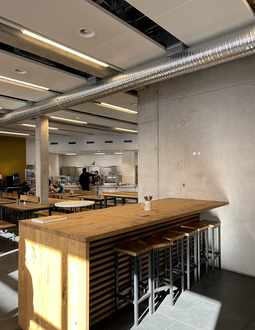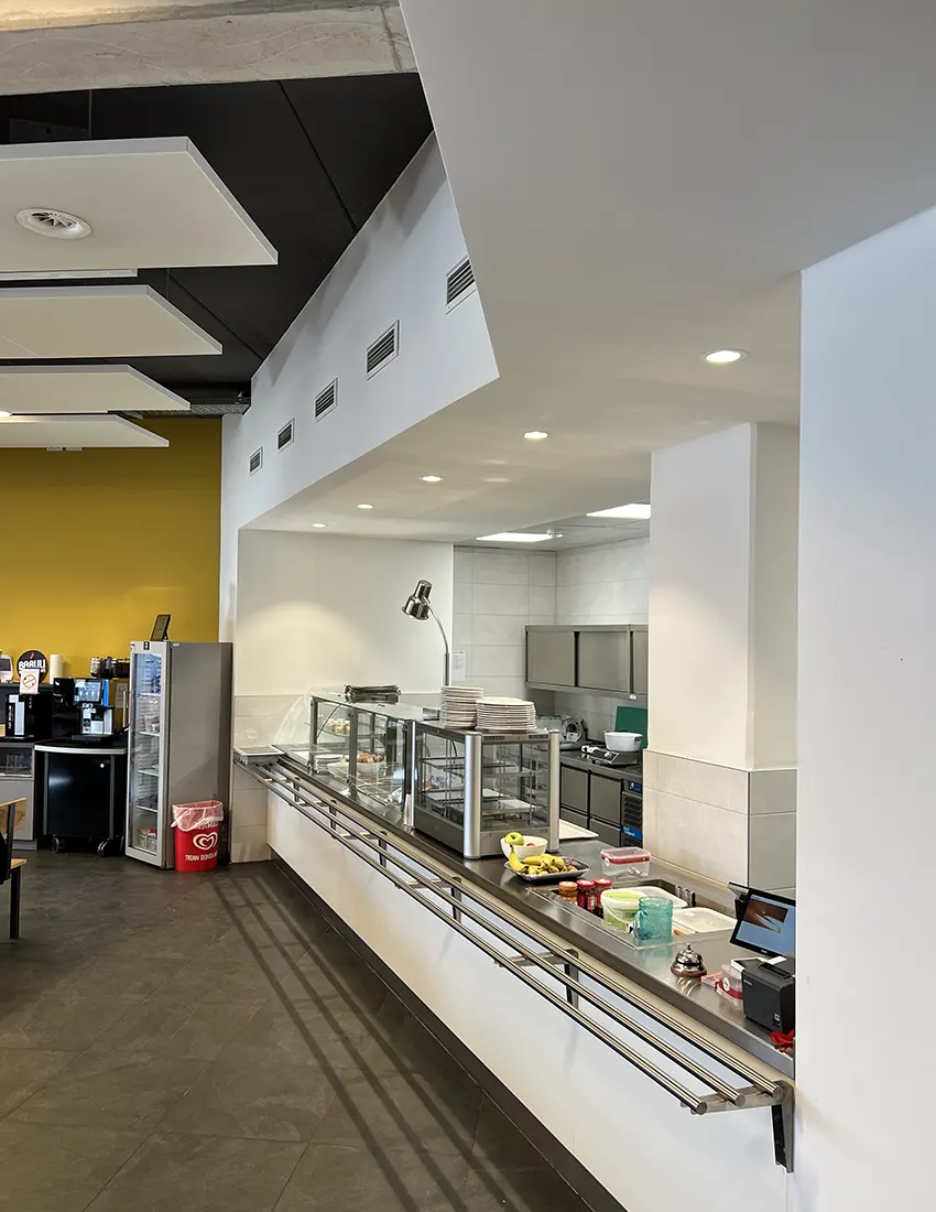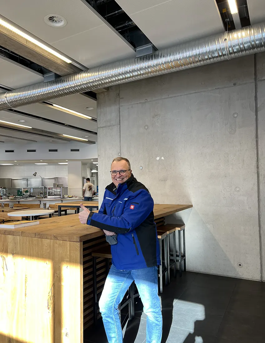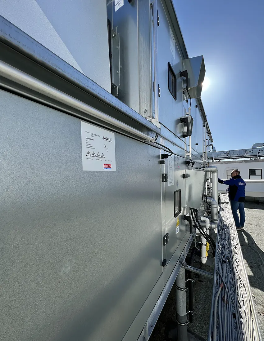 Für die Dickow Pumpen GmbH & Co. KG, Spezialist für hochwertige Kreiselpumpen für Industrieanwendungen, wurde im Jahr 2024 ein neuer Gebäudeteil vollständig errichtet. Entstanden ist eine moderne Kaltküche mit vorgelagerter Essensausgabe sowie einem einladenden Ess- und Aufenthaltsbereich. Die komplette Lüftungstechnik – für Küche und Essbereich – wurde von uns, Köhler HLS, geplant und umgesetzt. Das dafür installierte Lüftungsgerät befindet sich auf dem Dach und sorgt zuverlässig für die Be- und Entlüftung der Räumlichkeiten. Die Beheizung erfolgt dabei mittels Deckenstrahlplatten mit integrierten Luftauslässen.